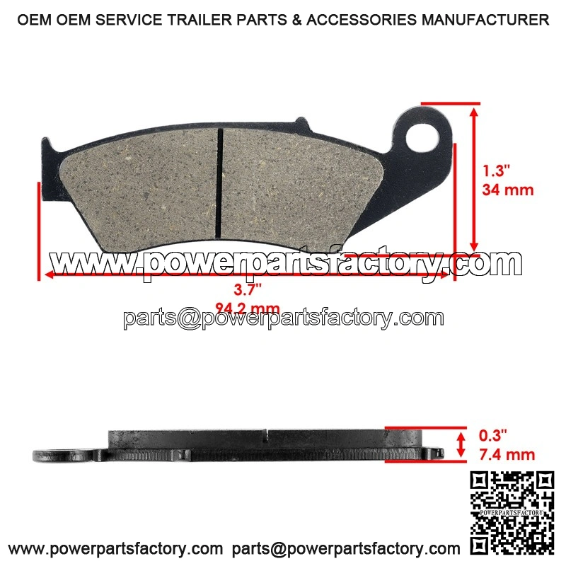 Length: 67mm – 2.6 inWidth: 36mm – 1.4 inThickness: 9.3mm – 0.4 inSEMI METALLIC BRAKE PADS ARE FOR LEISURE USE MADE FROM RESINMATERIALS BLENDED WITH UP TO 30%-50% METAL FIBERS.